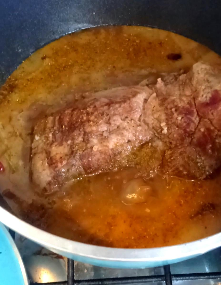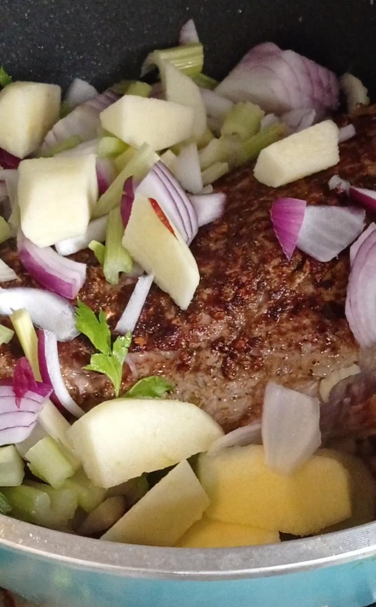 Entonces se me ocurrió hacer esta bondiola en la olla, con algunos vegetales y manzanas, y reemplace la cerveza por sidra, y quedo genial!!