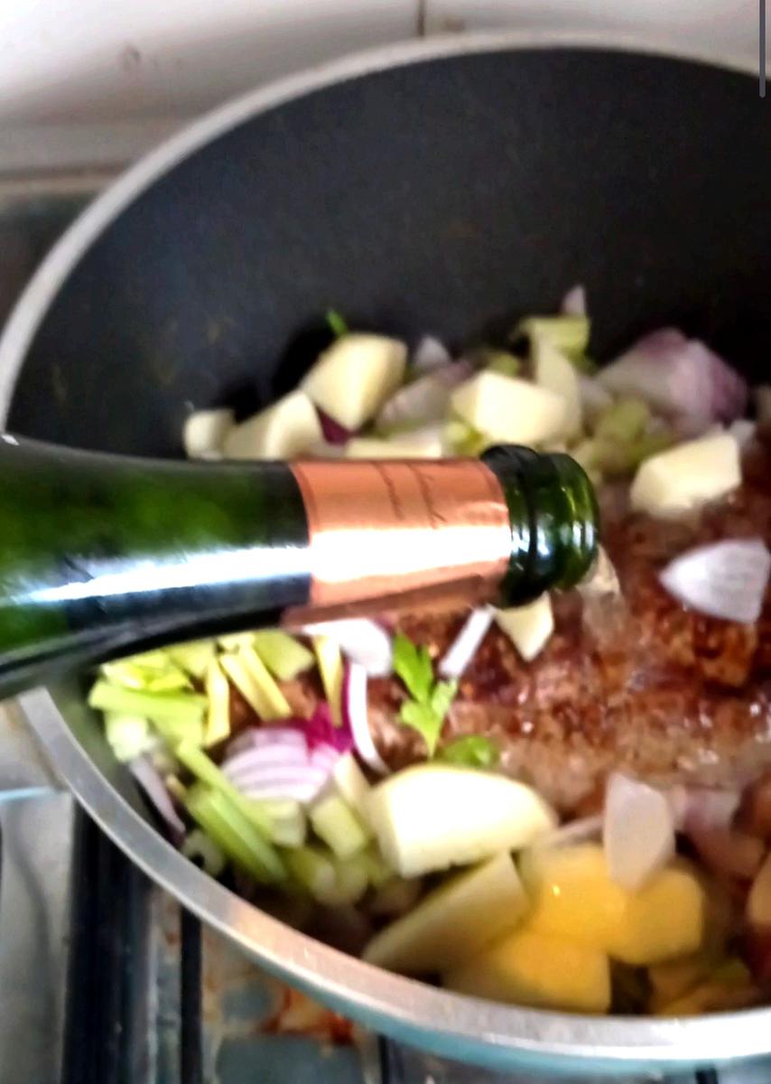 Cuando la bondiola esta dorada, agregar los vegetales , pero dejar la mitad de la cebolla , las manzanas cortadas y la sidra