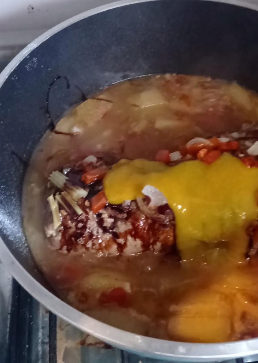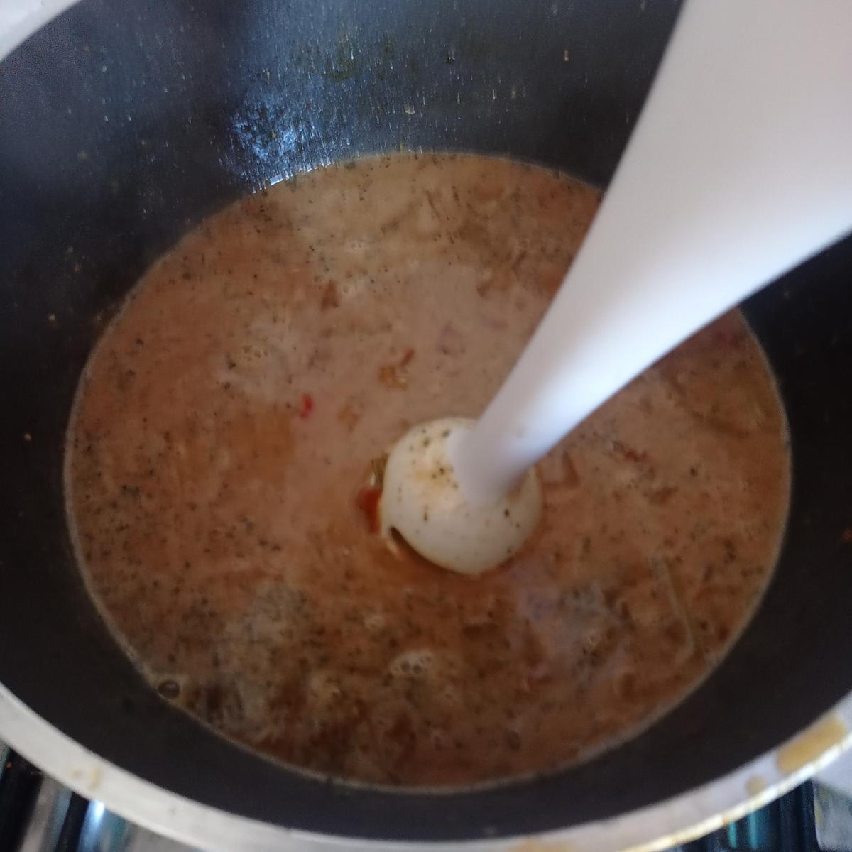 Cuando esté cocida y veamos que al pinchar el líquido es claro, apartar la bondiola y mixear el liquido que quedo de cocción, y dejar que la salsa resuma unos minutos.