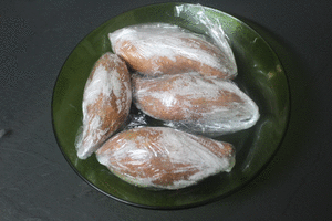 Colocamos una cucharada de azúcar en cada plástico y envolvemos los boniatos con dichos plásticos azucarados.