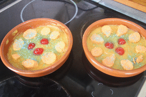 Añadimos las rodajas de boniato alrededor de las cazuelitas de barro.