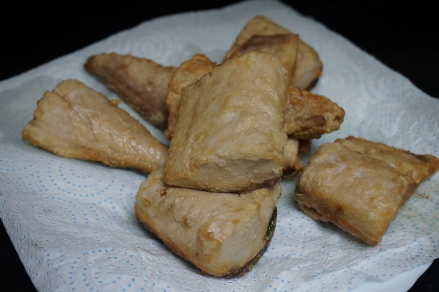 Ponemos una sartén con aceite y vamos friendo los trozos de bonito a fuego fuerte, para dorarlos por fuera, un minuto por cada lado.