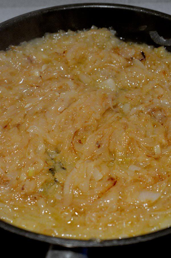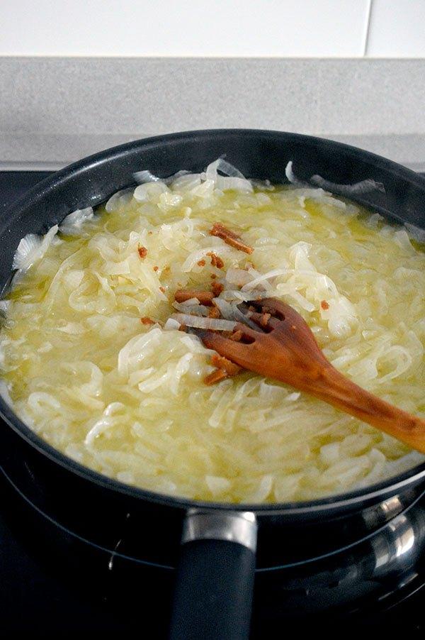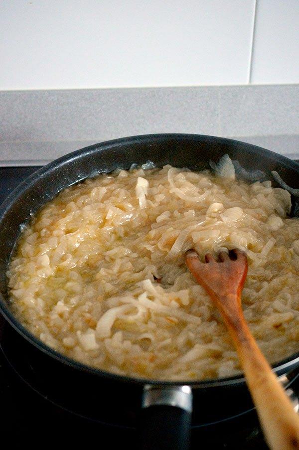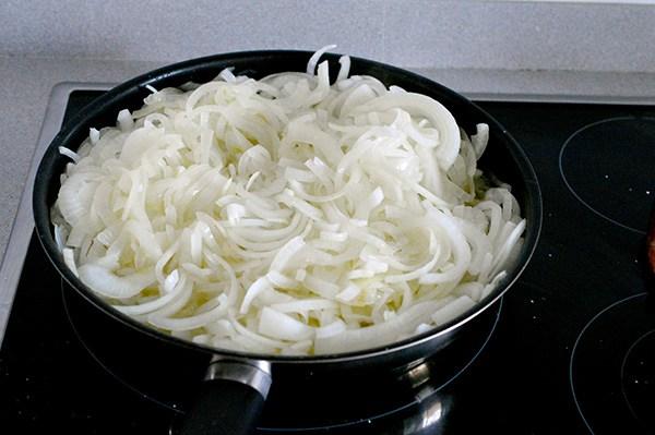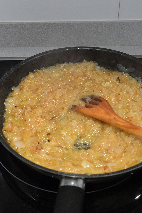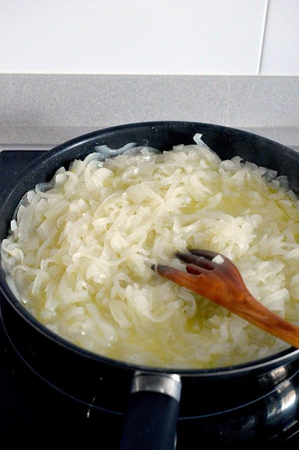 Añadimos las cebollas junto con un poco de sal y las tapamos para ayudar a que pierdas volumen.