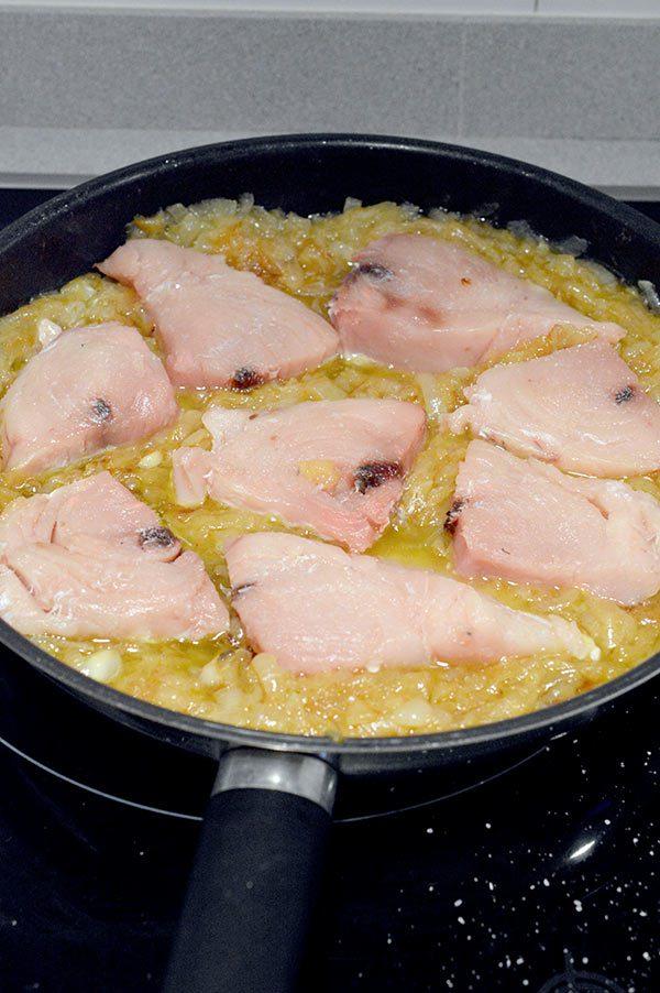 Lo salamos y lo añadimos a la cebolla, yo lo tengo unos 3 minutos por un lado y dos por otro, siempre dependiendo del grosor de la rodaja, mas vale quedarse corto y cocinar un poco mas que pasarse con el punto de cocción!