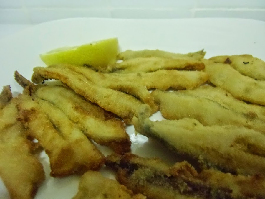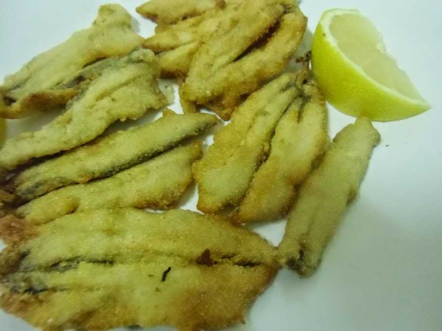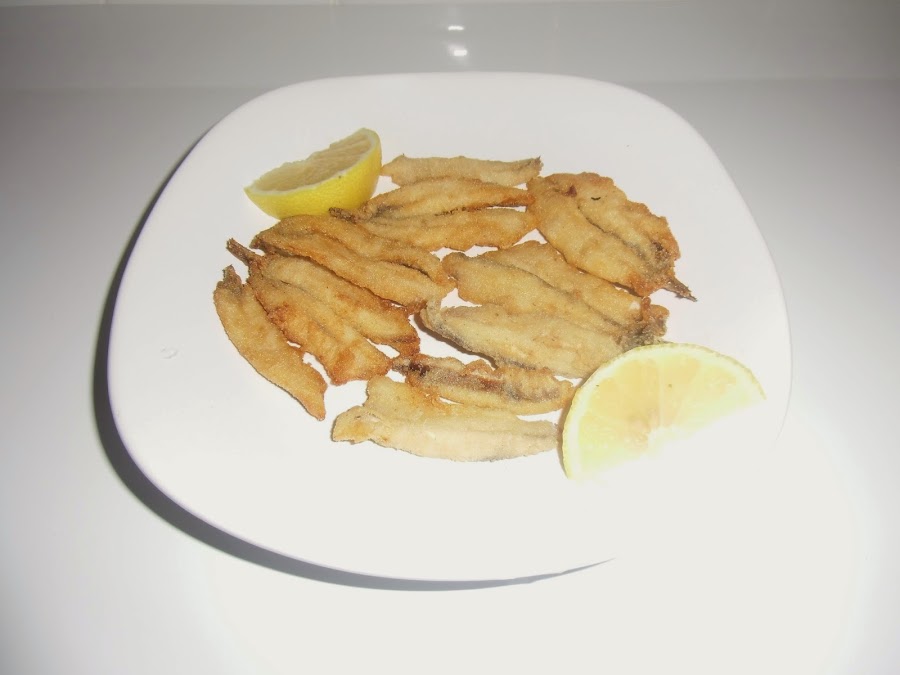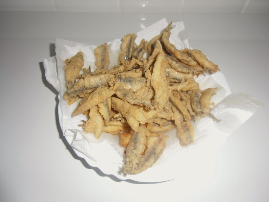 Pasado ese tiempo sacamos los boquerones, los secamos con papel, enharinamos de uno en uno y los freímos en abundante aceite muy caliente