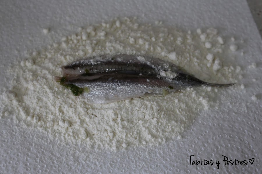 Vamos a secar ligeramente los boquerones y a pasarlos por harina. Retiramos el exceso de harina dando unos golpecitos al pescado con la palma de la mano.