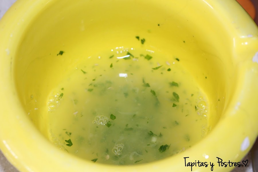 En el mortero machacamos el diente de ajo, con las hojas de perejil picado. Cuando esté machacado, añadimos el zumo de limón. Yo solo he puesto un limón, si veis que se queda escaso para cubrir los boquerones agregáis más zumo.Esta mezcla la vertemos sobre el pescado y lo dejamos en la nevera una media hora. Cuanto más tiempo lo dejéis más sabor cogerá.