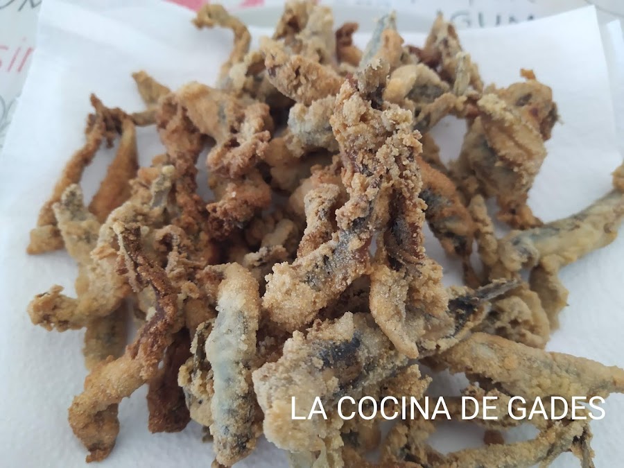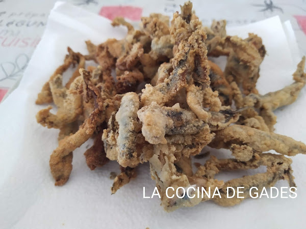 Escurrimos los boquerones adobados y enarinamos y freimos en el aceite caliente.