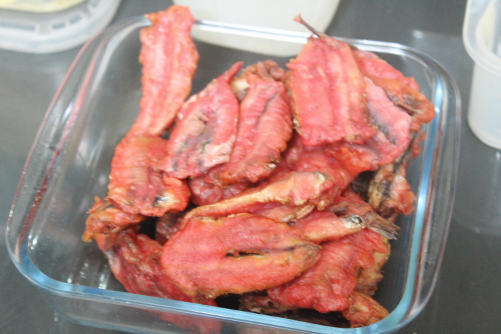 Como hacía tiempo que no comemos pescado fresco en casa y el otro día me encontré en casa un paquete de harina de tempura, le pedí a la mujer que cuando fuera al supermercado comprara medio kilo de boquerones para freírlos con harina de tempura, pero en esta ocasión quise hacer una tempura diferente, añadiéndole un chorrito de colorante alimentario rojo.