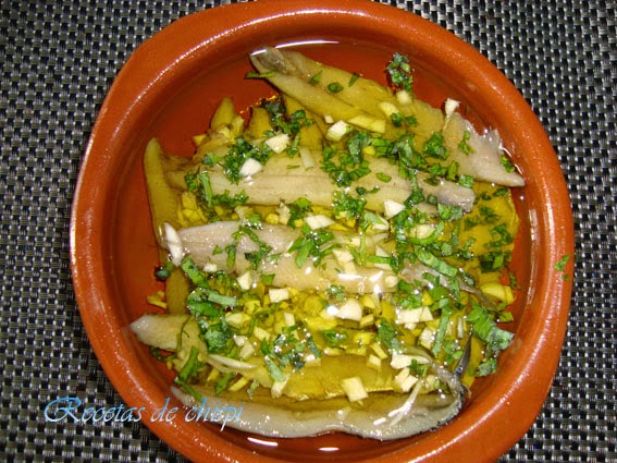 Sacar del vinagre y secar, ponerlos en el recipiente que se vaya a servir, picar los ajos y el perejil y echarselos por encima junto con el aceite, dejar macerar un par de horas y servir.