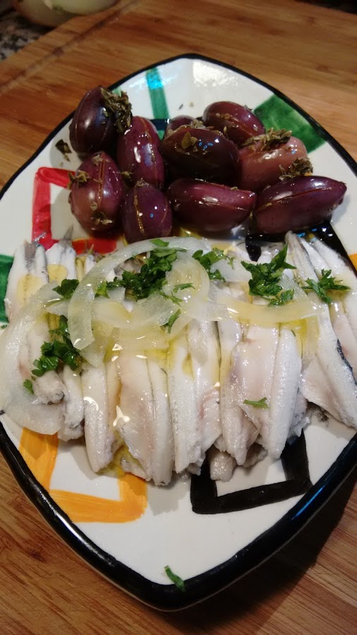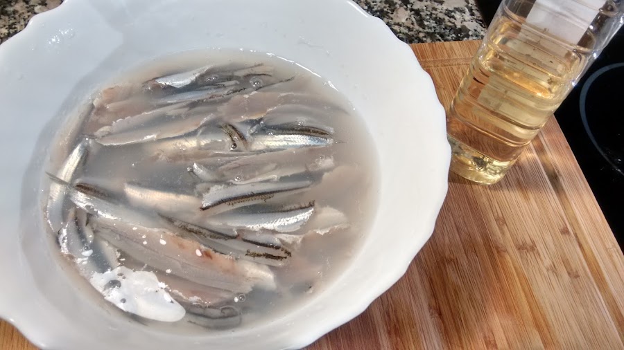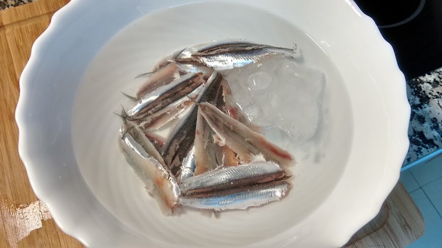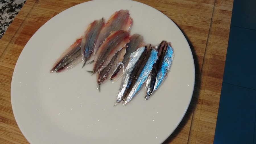 Quitar la cabeza, vísceras y la espina central de los boquerones. Yo lo hago debajo del grifo, dejo caer un hilo de agua, de esta forma la sangre resultante del descabezo no se queda en el boquerón.