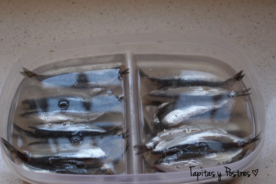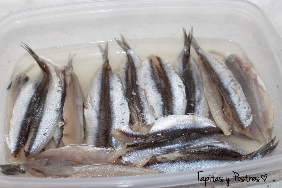 Para evitar el anisakis, es conveniente congelar el pescado al menos un par de días. Una vez limpio, sin cabeza, ni espina y abierto, lo lavamos bien (sin manipular mucho) y lo ponemos en un recipiente con agua que lo cubra. Congelamos. Yo lo hago así, después solo tengo que sacar el bloque de hielo con los boquerones y dejar que se descongele.