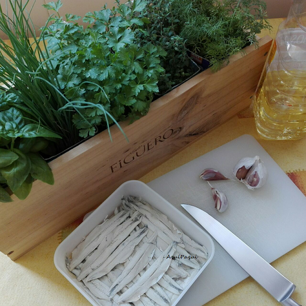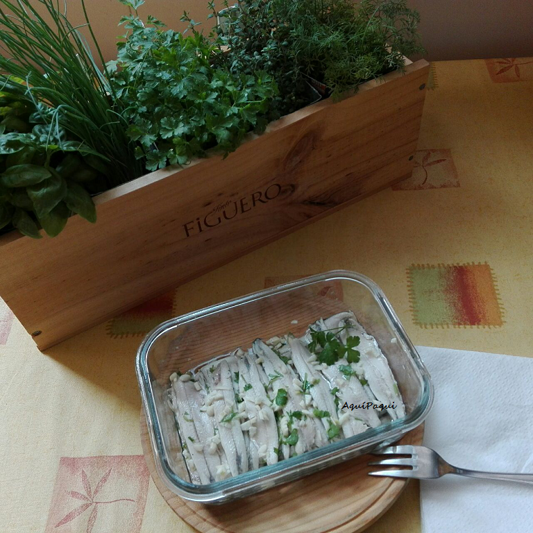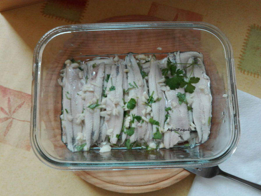 Colocar en capas como si fuese lasaña intercalando boquerones, perejil picado, ajo picado y chorrito de aceite; acabando con ajo, perejil y aceite.