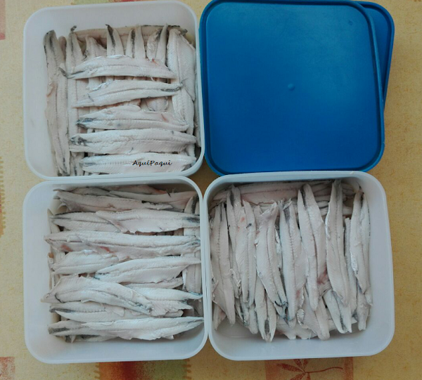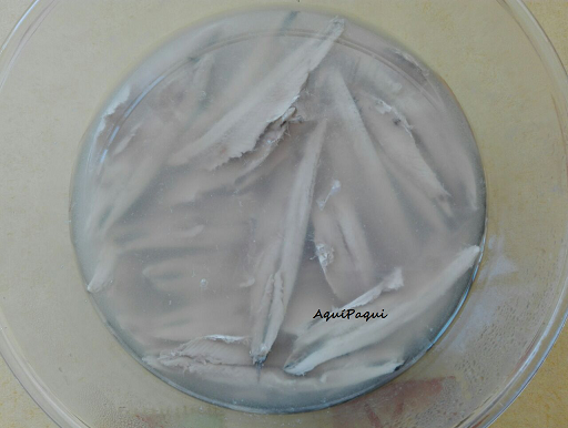 Quitar la tripa, espinas y cabeza de los boquerones dejando solo los lomitos. Lavar muy bien, pero muy bien, pero requetebien con agua fría y dejarlos sumergidos en agua fría, cuando lleven un rato cambiar el agua. E ir cambiando el agua tantas veces como creamos hasta que el agua se mantenga limpia. Escurrir y reservar.