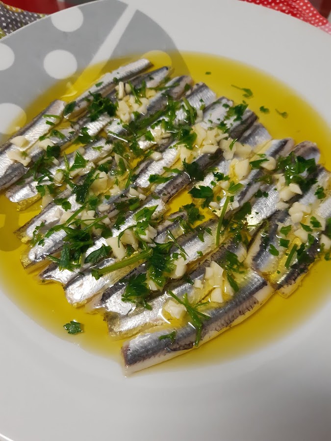 Volvemos a escurrir los boquerones y los ponemos en un plato,añadimos aceite de oliva ,ajo y perejil, y un poco de sal.