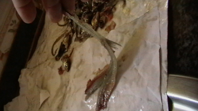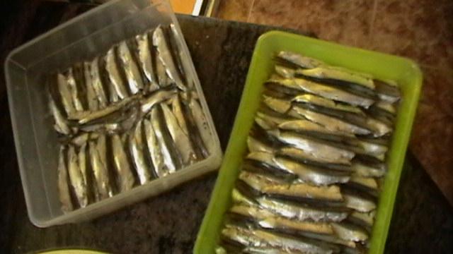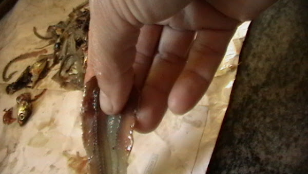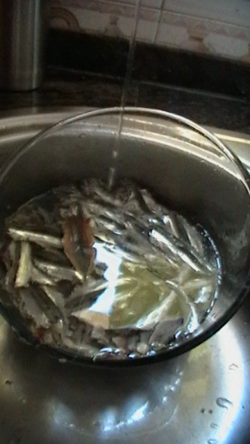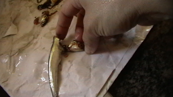 por la mitad clavamos la uña, (si la tenemos.... jajajajja), estiramos la raspita y la separamos del otro lomito..... con las mismas uñas la estiramos y dejamos el boquerón limpito...