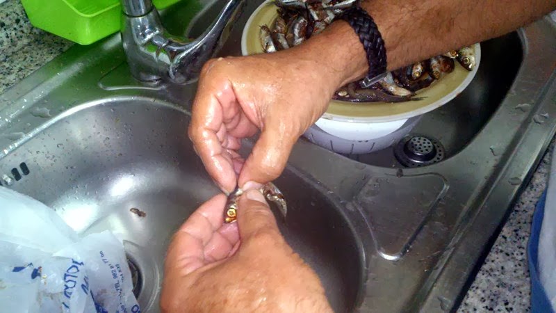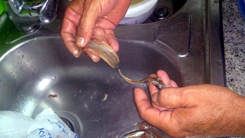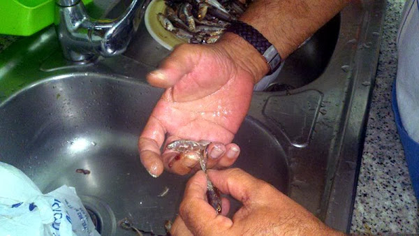 lavamos el pescado y lo limpiamos, eviscerandolo. Tomamos la cabeza y arrastramos con la espina dorsal para que nos queden limpios los flancos, obteniendo dos filetes, de la forma como se ve en las fotografías