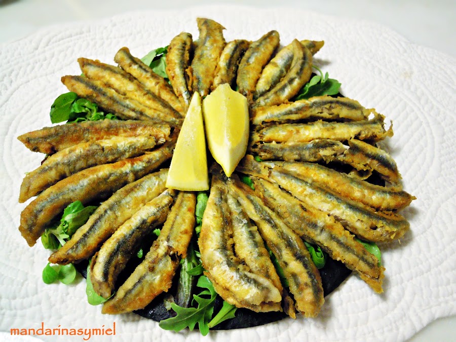Junta de 3 boquerones en 3 por la colita y fríe en abundante aceite caliente por tandas para que no se enfríe el aceite.
