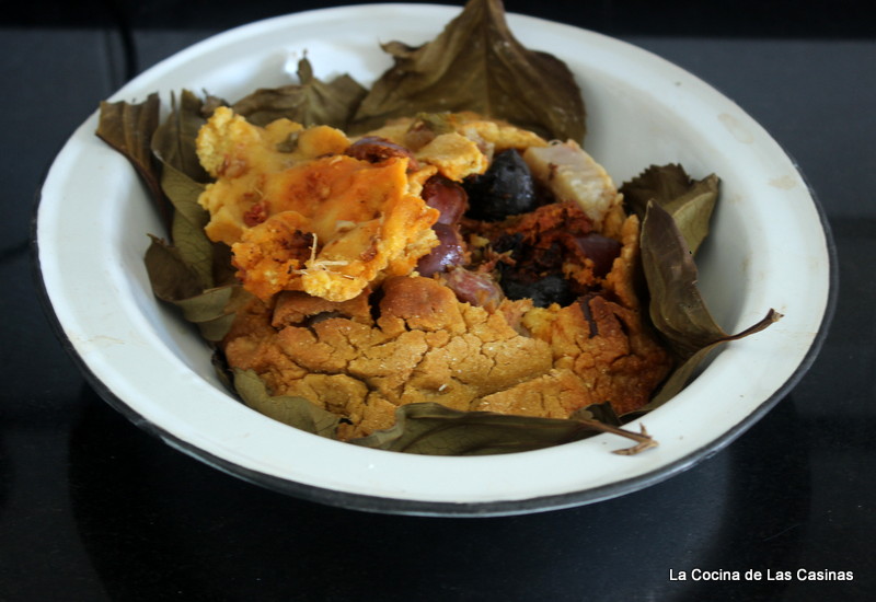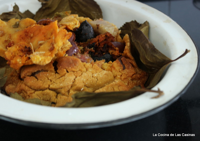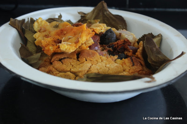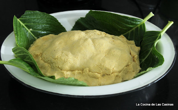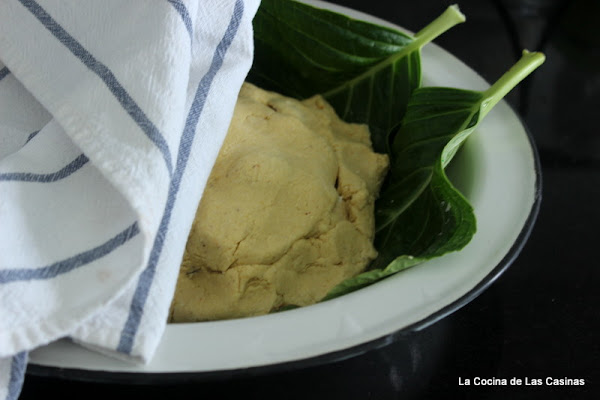Es una masa muy fácil, de Harina de Maíz que debes de envolver en hoja de berza humedecida en agua. Como no tengo, utilicé hoja de hortensia. El resultado es peor, la masa se seca un poco porque este tipo de hoja no guarda la humedad que debe de transmitirle.