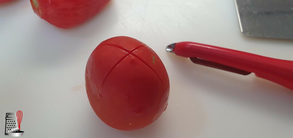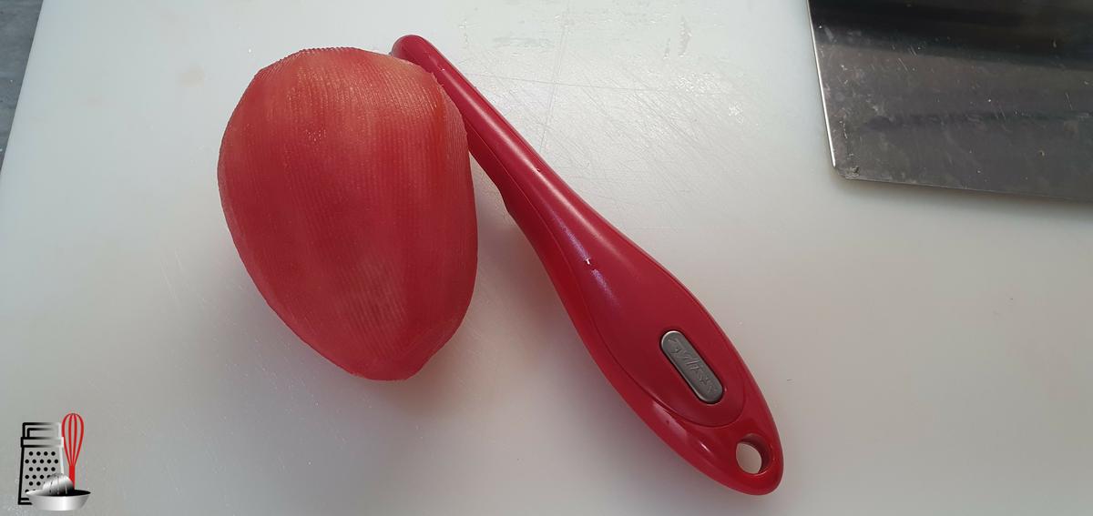 Para pelar los tomates con facilidad, hay dos opciones. Una es compraros un pelador como este, de la marca Zyliss, el cual os recomiendo porque es una muy buena inversión, o hacerles una cruz en la base y escaldarlos.