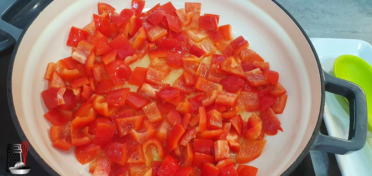 En un cazuela o sartén, ponemos un poco de aceite. Cortamos los pimientos también en daditos y los pochamos. Cuando estén casi hechos, añadimos la berenjena .