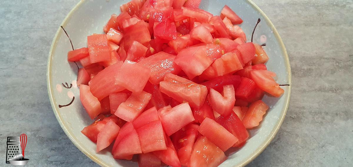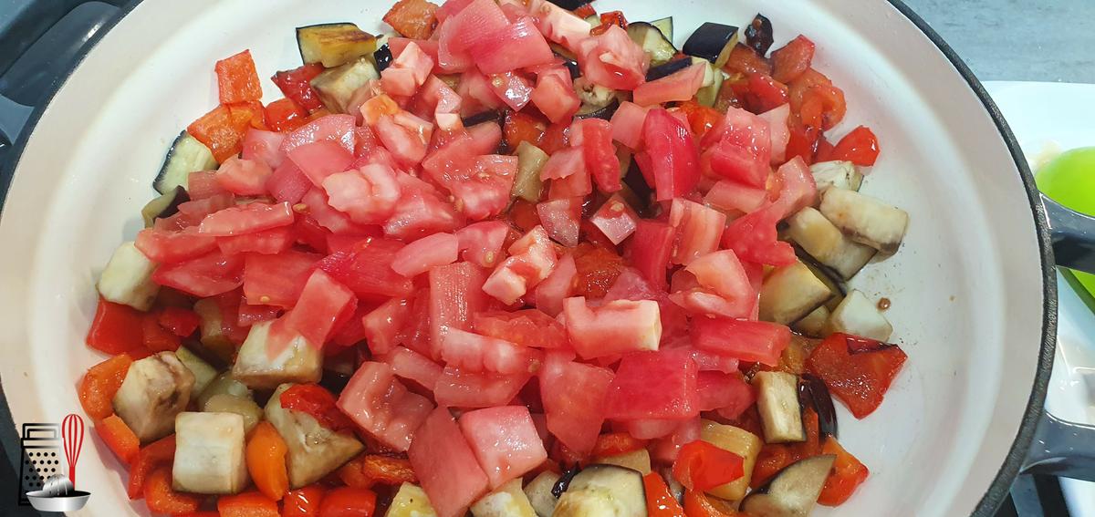 Una vez la berenjena empieza a ponerse blandita, añadimos los tomates pelados, sin pepitas y en daditos.