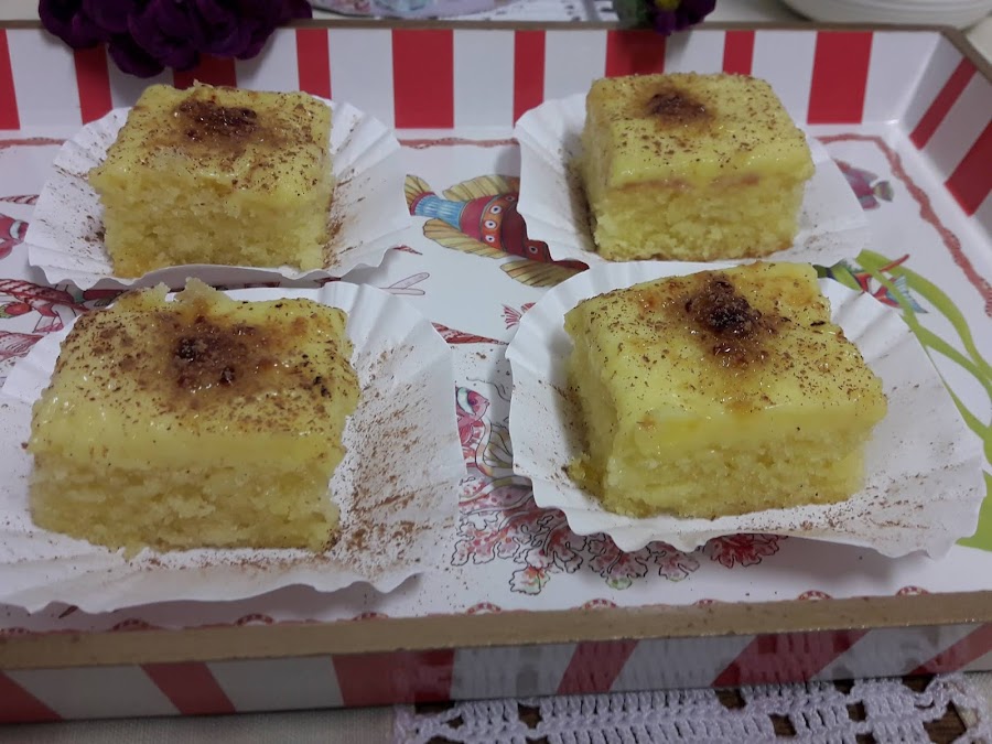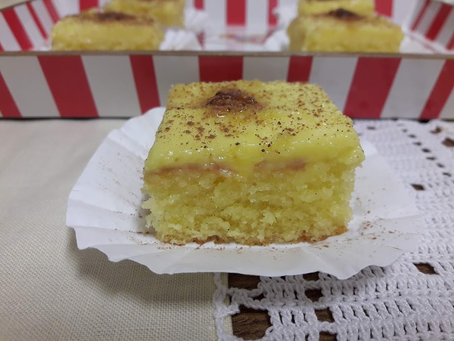 Cubrimos el bizcocho ya almibarado con la crema pastelera, alisando bien la superficie. Metemos en el frigorífico.