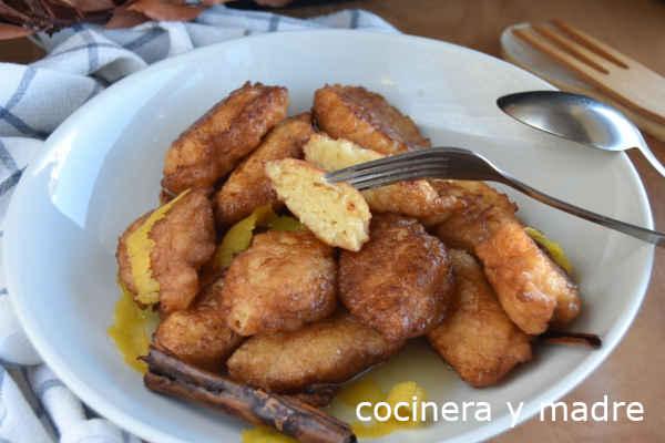 Ponemos abundante aceite a calentar y con la ayuda de una cuchara damos forma a los borrachines, mojamos cada vez la cuchara en aceite y freímos por tandas dorando por ambos lados, a fuego medio.