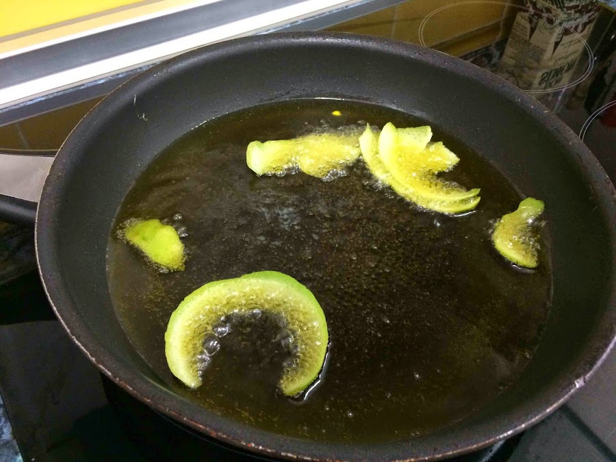 Cuando esté dorada la cáscara del limón la sacamos con una espumadera y apartamos la sartén del fuego.