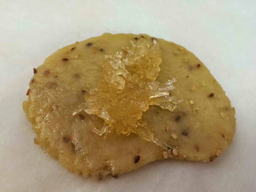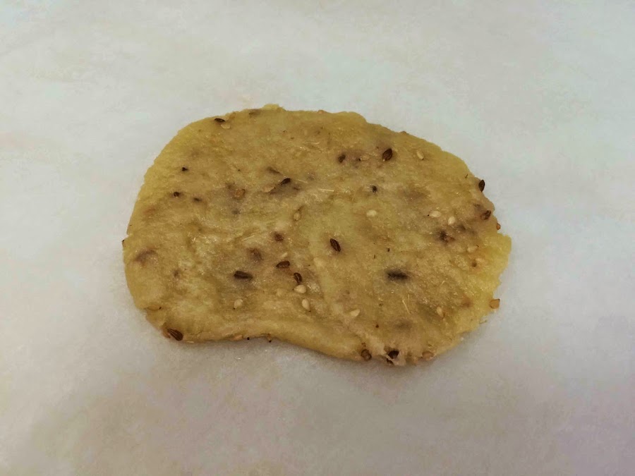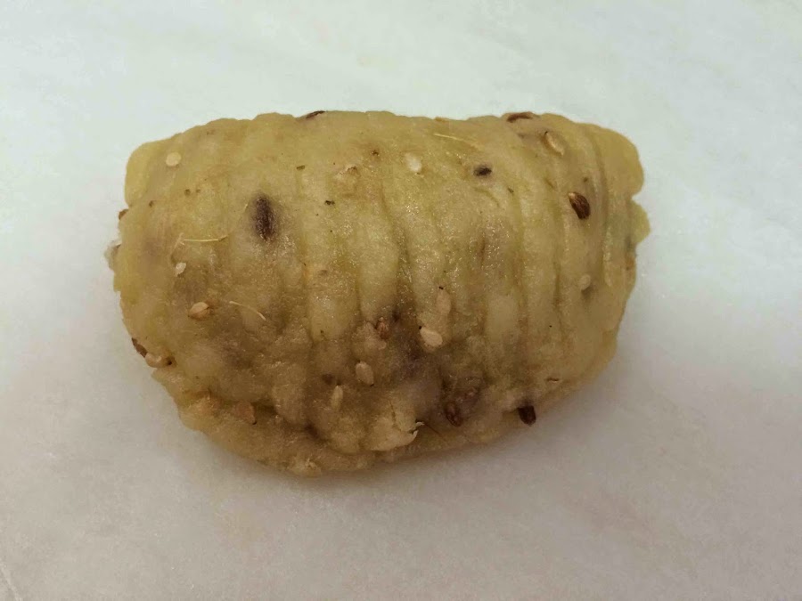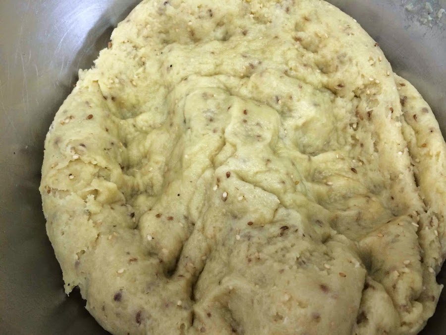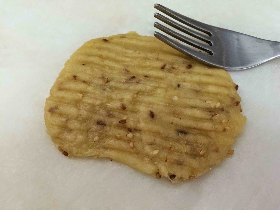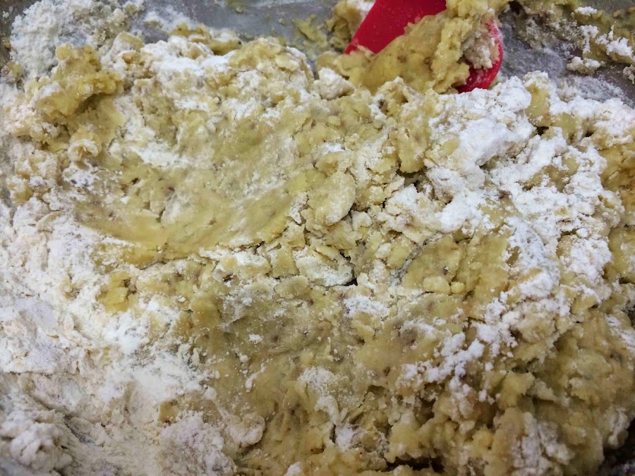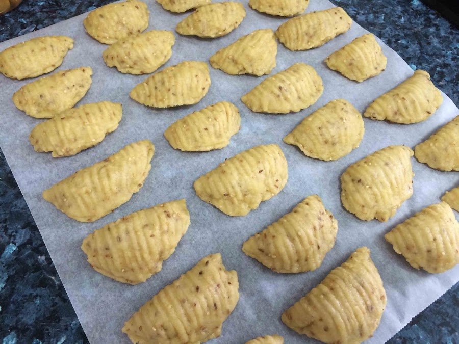 Transcurrido ese tiempo, vamos sacando pedacitos del tamaño de una nuez y en una mesa de trabajo forrada con papel de horno la aplastamos con la palma de la mano. No debe quedar redonda, debe ser un poco alargada tal y como la de la imagen.