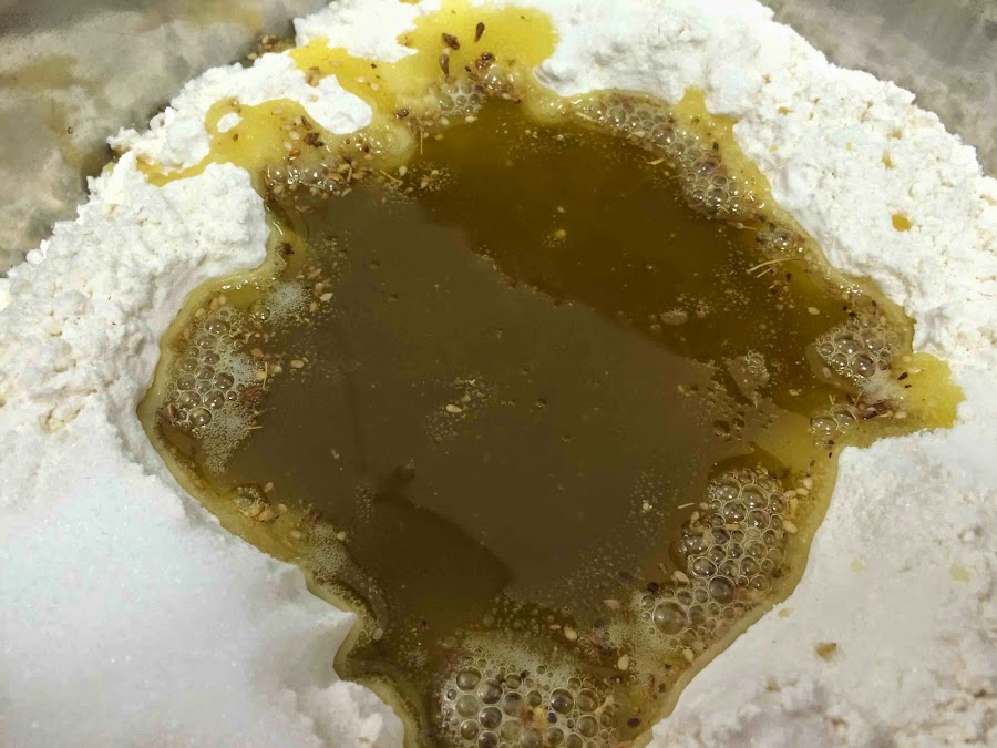 Le agregamos el aceite junto con el ajonjolí y la matalaúva. Continuamos añadiendo los vinos, el azúcar y las copas de anís.