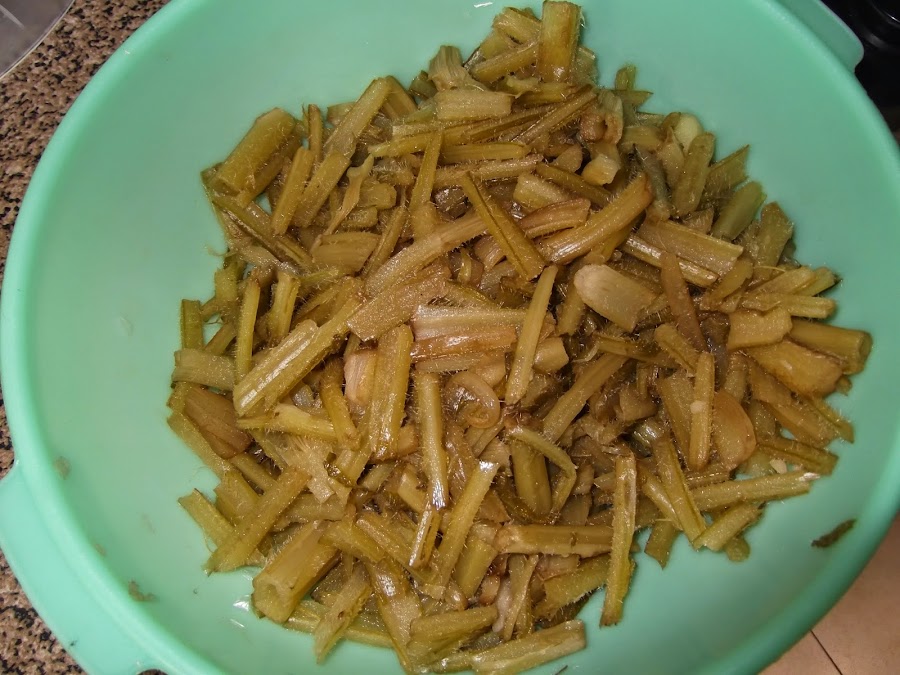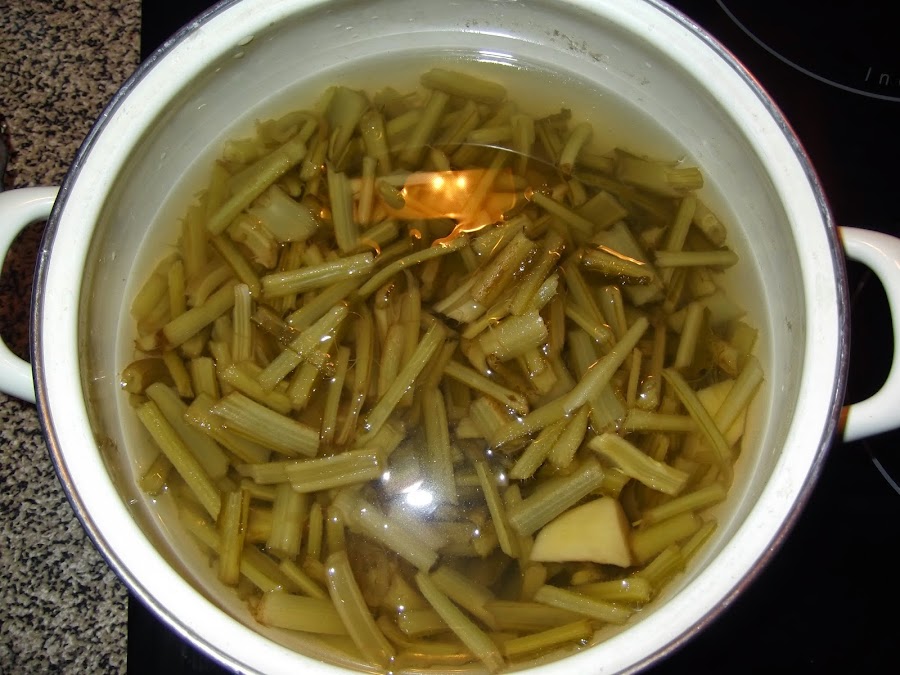 Lo primero que hacemos es quitarle las hojas y dejar sólo el tallo. Se cuece el tallo que hemos cortado en trozos de tres o cuatro centímetros durante 20 minutos si lo hacéis en olla express o el doble si lo hacéis en una olla normal. En la misma cocción podéis añadir las patatas peladas y cortadas y se cocerán al mismo tiempo. También le añadís medio zumo de un limón para que no se pongan negras y se salan.