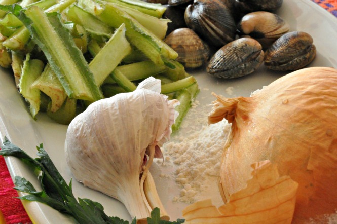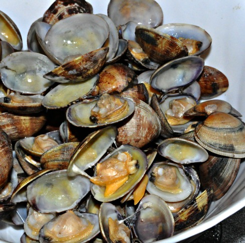 En una cazuela, ponemos el vino blanco y las almejas (que ya teníamos en agua con sal, para que soltaran arena, desde temprano ;) ). Damos calor, tapamos y dejamos que se abran.