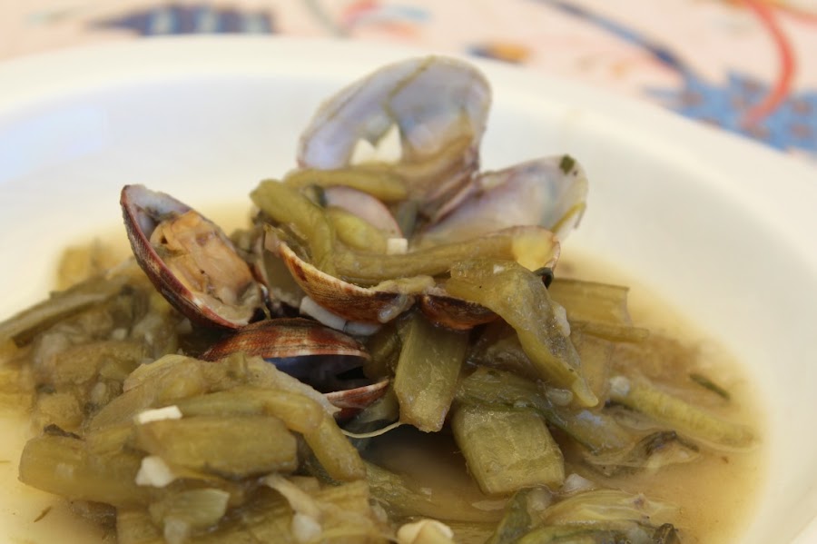 Incorporamos las almejas y las borrajas. Integramos y cocinamos otros 2-3 minutos.