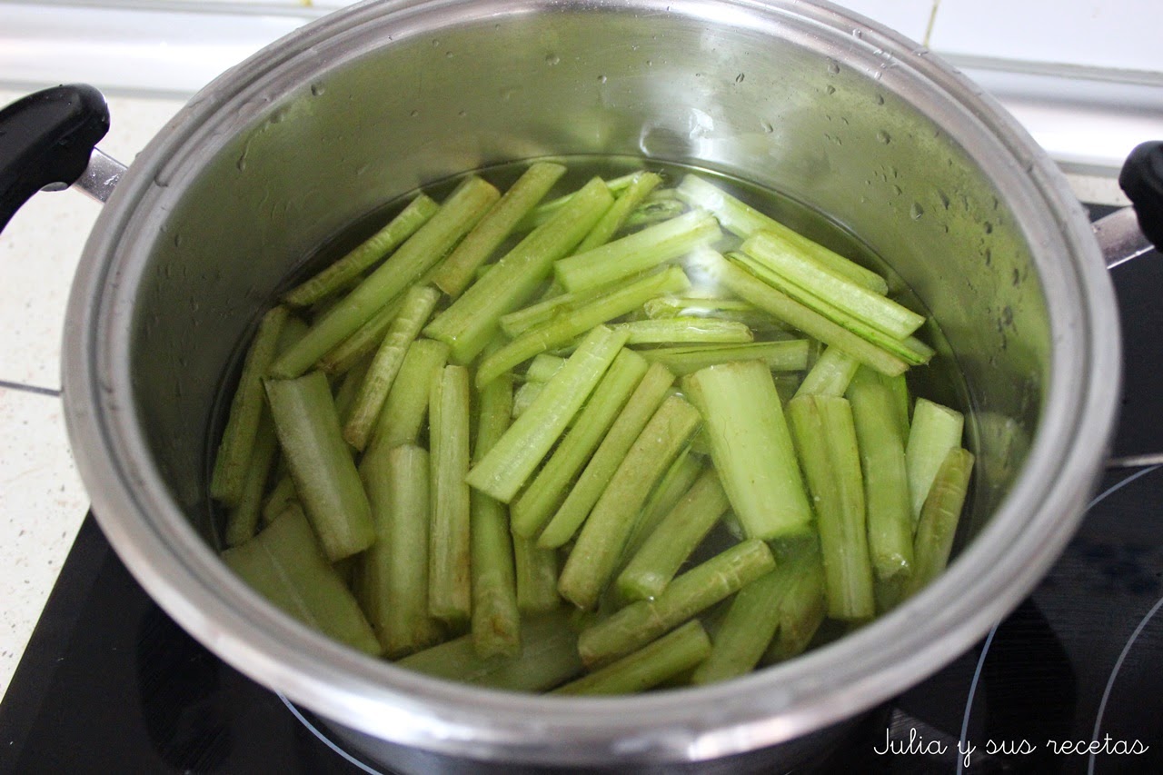 Limpiamos y cocemos los tallos de la borraja, partida a trozos, con agua y sal hasta que esté al dente. Las escurrimos y reservamos un poco del caldo de cocción.