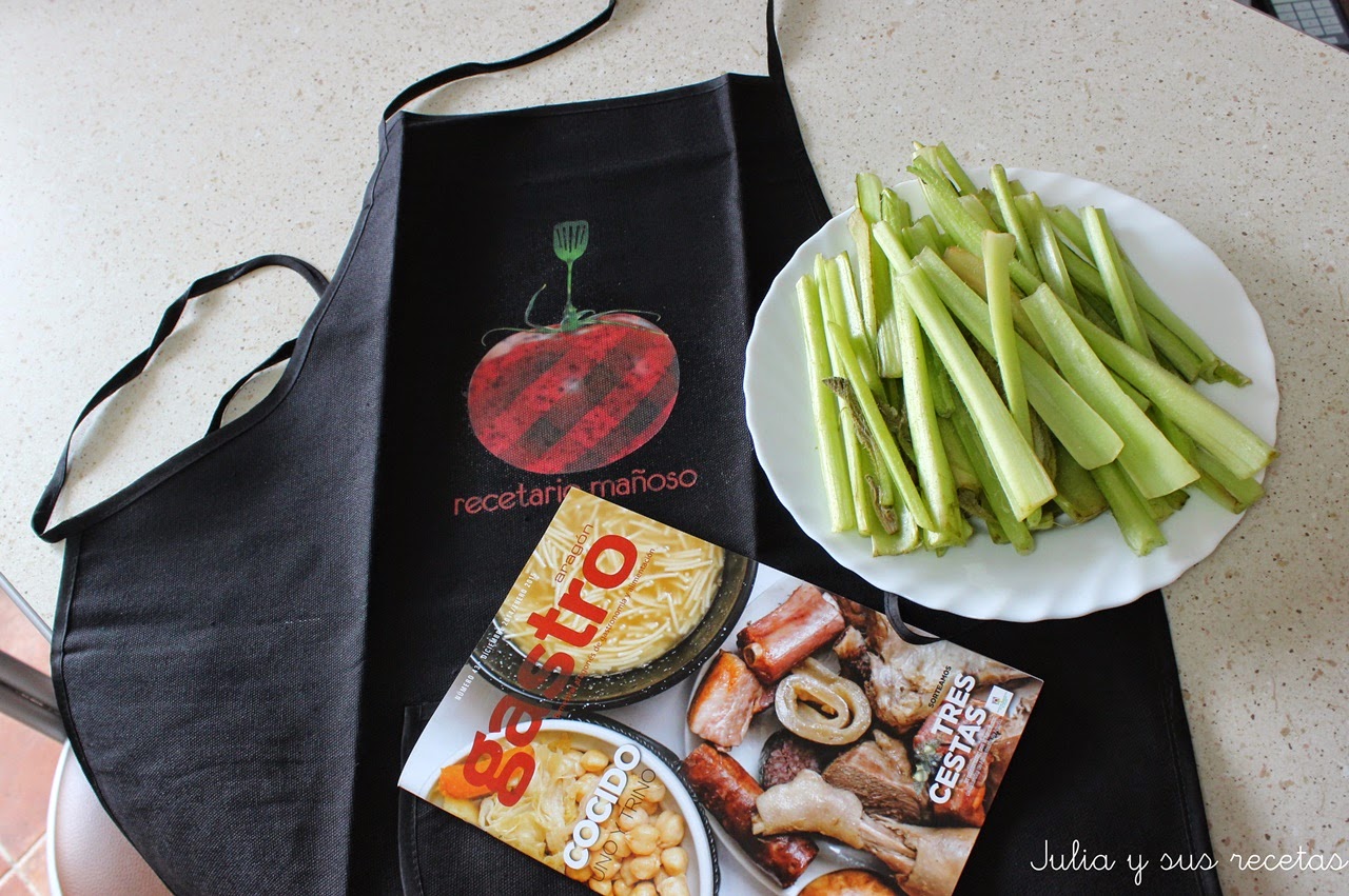 Para mi primera receta he elegido la borraja, y lo que os voy a contar de ella no es su origen , ni sus propiedades nutricionales , que las tiene. No... os voy a contar que estas borrajas han llegado a mi casa vía paquete postal desde Zaragoza. Siiii...desde Zaragoza, Pilar , que fue mi tutora en el último mañoso y a la que yo aprecio mucho, no se le ha ocurrido otra cosa que mandarme un paquete con unas... ¡¡deliciosas Borrajas!!!, Bueno, ademas de las borrajas venía mas cositas, entre ellas un precioso mandil con el logo del Mañoso, un numero de la revista Gastro, con información sobre eventos y productos de Aragón y un iman para el frigo del logo del mañoso. Todo ello acompañado del cariño que desprenden este grupo de Mañosos.