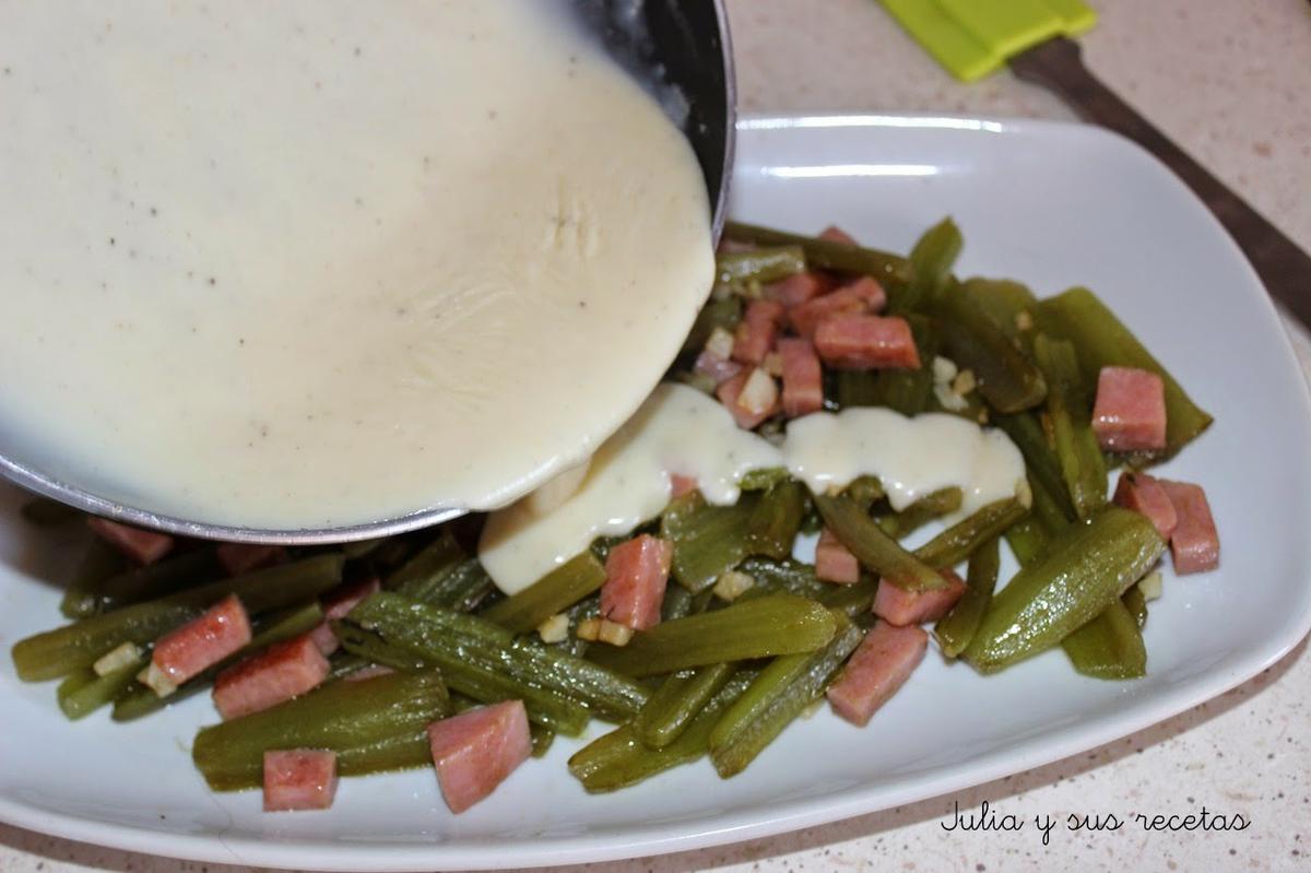 La echamos sobre las borrajas y la gratinamos en el horno hasta que este dorada.