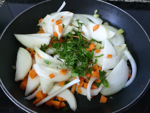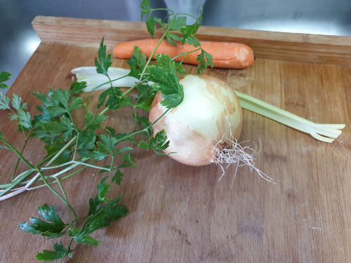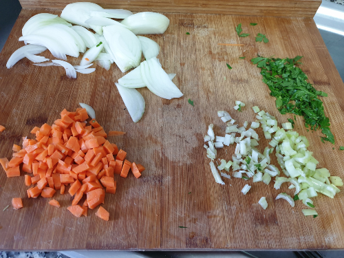 - Pica la zanahoria y el apio en cuadrados pequeños. Pica el perejil. Corta la cebolla en juliana.
