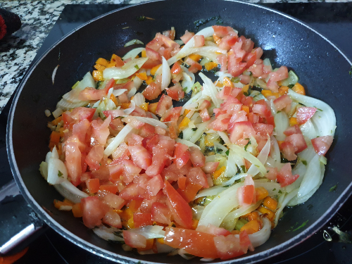 Añade el tomate despepitado y cortado en cubos. Rehoga de nuevo.