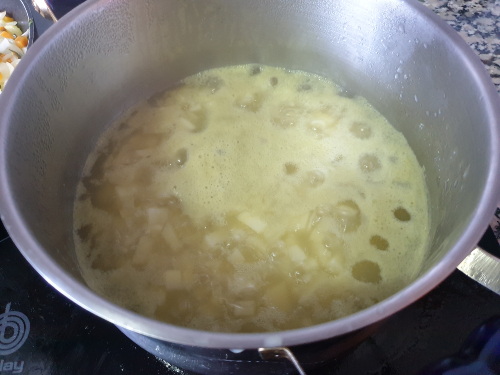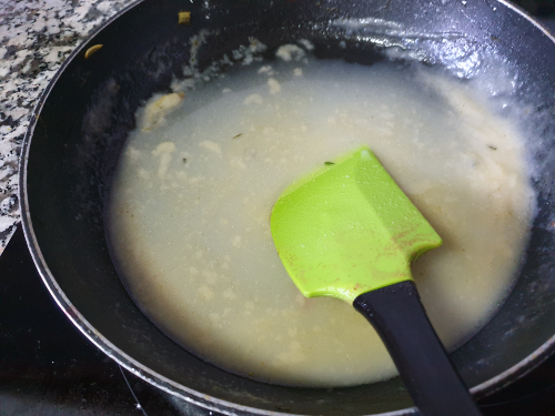 - Dora la harina en la mantequilla con una pequeña cantidad de caldo.