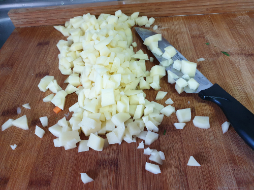 - Se pone el caldo en un cazo, aunque deja aparte medio vaso, y calientalo hasta que hierva. Se agregan las patatas cortadas en cubitos pequeños.