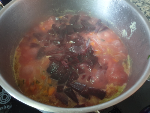 - Luego añade la remolacha, las verduras doradas, la pimienta, la sal y la hoja de laurel.