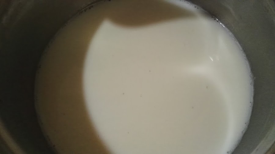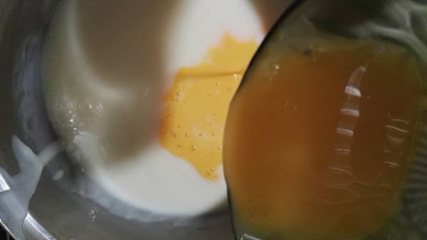 Cuando comience a hervir, lo retiramos del fuego y colocamos un cucharon de la leche en el recipiente donde tenemos las yemas y mezclamos bien para que no se vayan a cuajar desproporcionadamente por el calor.