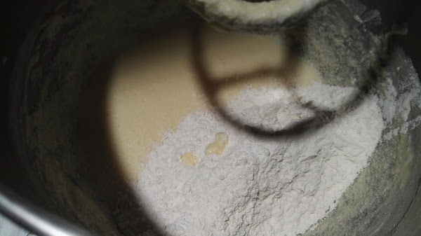 En un recipiente mezclamos los ingredientes secos: harina, levadura y sal. Mientras que en otro recipiente mezclamos los líquidos: leche y agua.