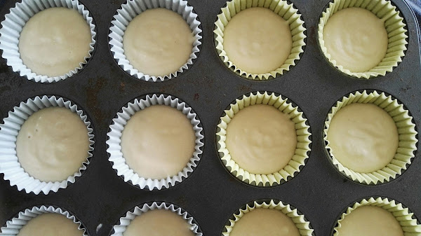 Preparamos una bandeja para cupcakes ya con las cápsulas colocadas y llenamos hasta la mitad cada una, horneamos a 180°C por 25 minutos o hasta que al insertar un palito salga limpio.