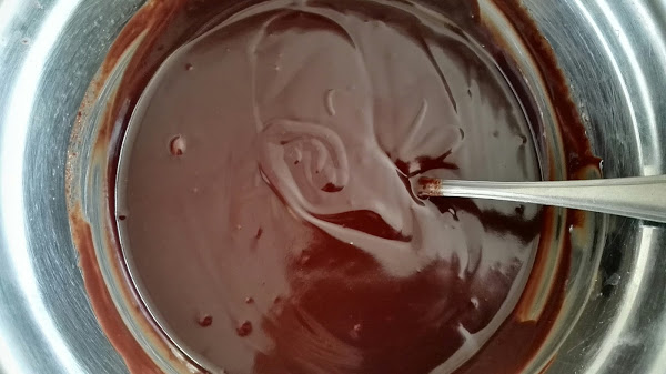 Hervimos la nata (crema de leche) y la agregamos al chocolate, dejándola reposar unos tres o cuatro minutos para que lo derrita y luego mezclar hasta que todo el chocolate se haya derretido y todo esté completamente integrado.