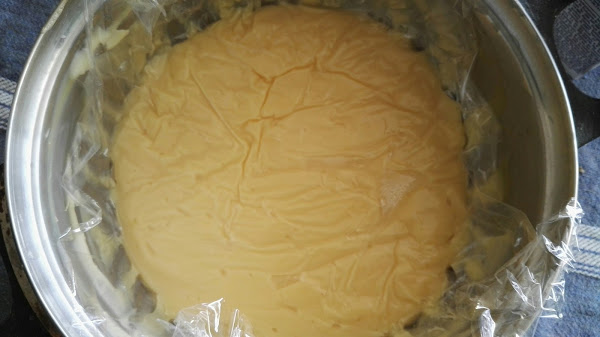 Al finalizar le colocamos un trozo de film, plástico de cocina encima para evitar que se forme la nata (crema de leche) por encima, y dejamos enfriar por completo a temperatura ambiente, esto tomará algunas horas.