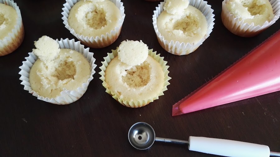 Mientras tanto con la ayuda de un parisien o quizás un cuchillo o cucharita, vamos haciendo un orificio en el centro de los cupcakes pero sin llegar hasta abajo.