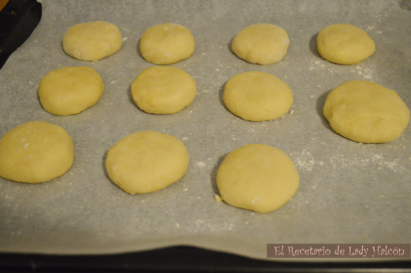 Haz unas bolas de unos 45 gr., aplástalas un poco como si fueran unas hamburguesas y colócalas sobre papel de hornear para que reposen 1 hora más. Si la masa sigue estando un poco pegajosa, como me pasó a mi, no te olvides de espolvorear un poco de harina sobre el papel y tus manos, así evitarás que se pegue.