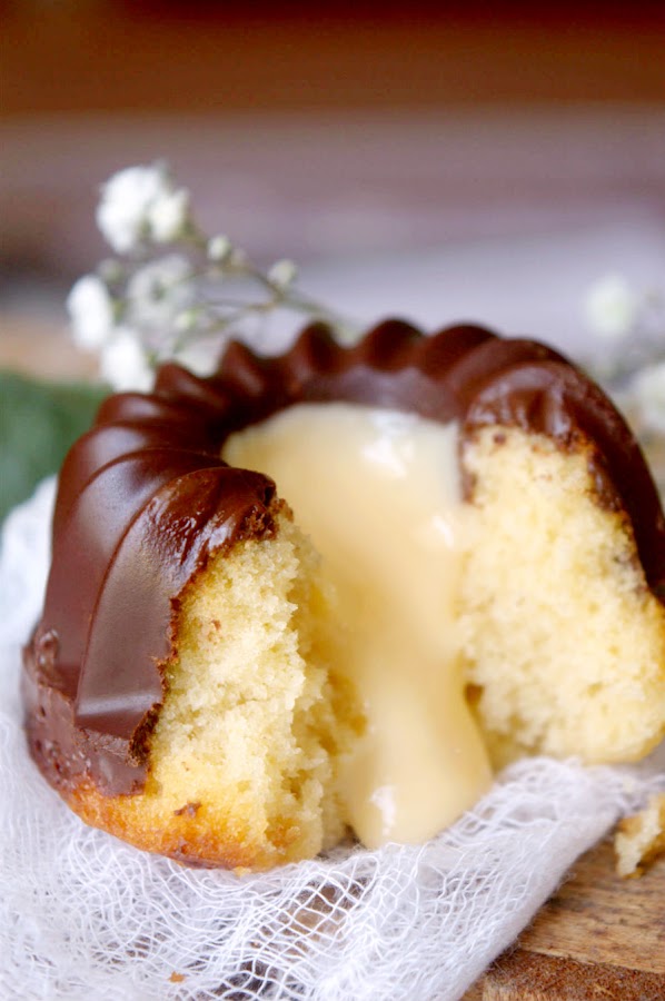 Por eso, este mes me he decidido por unos mini bundt, muy sencillos, rellenos de crema pastelera y con cobertura de chocolate. Unos Boston cream mini bundts, sencillos de llevar y de comer. A los niños les encantan porque son pequeñitos, como sus manitas, llevan un poquito de chocolate por encima, y la crema pastelera que está buena con lo que sea, hasta a cucharadas.